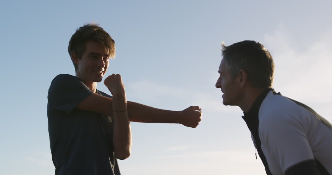 - Father and Son Exercising Outdoors at Sundown