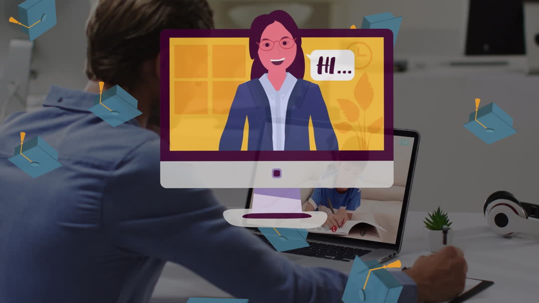 An animation showing a father and son engaging in an online video call surrounded by educational icons, indicating a focus on virtual learning or communication. This animation is suitable for concepts related to remote education, family interactions, digital communication technology, or online learning platforms. Can be used in educational blog posts, training materials, or social media content about internet education.
