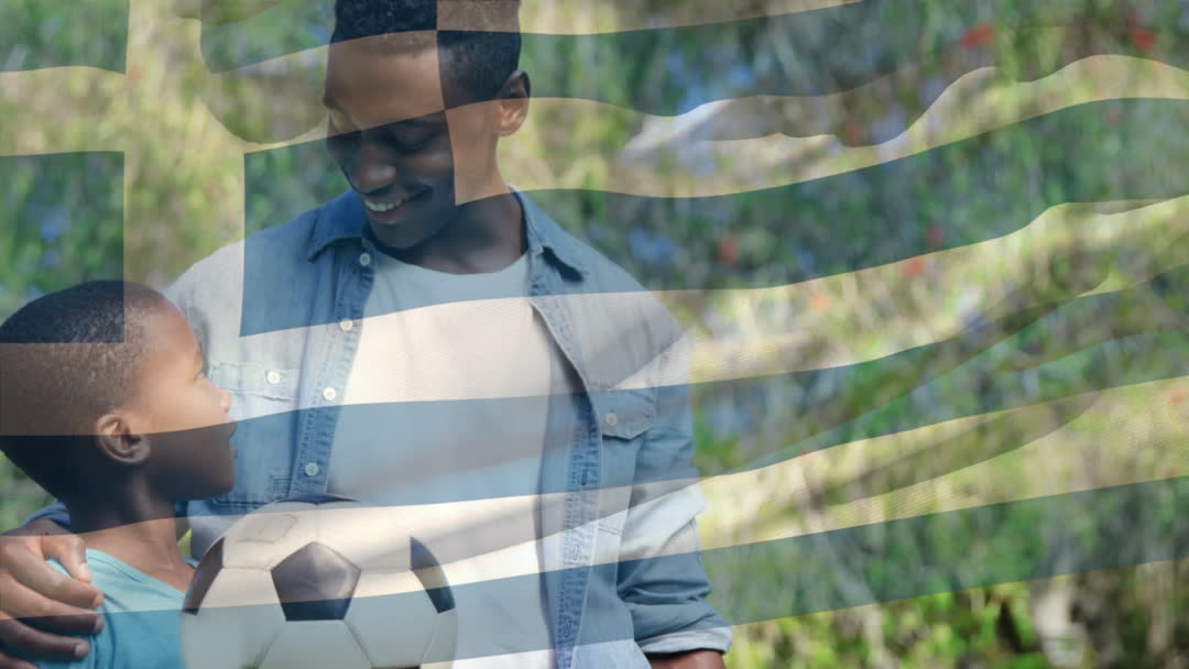 Bonding moment between African American father and son outdoors with a football, symbolizing unity and connection with Greek culture through the overlay of the waving Greek flag. Perfect for illustrating multicultural family dynamics, celebrating sports and heritage, national unity, or promotional material related to Greek culture.