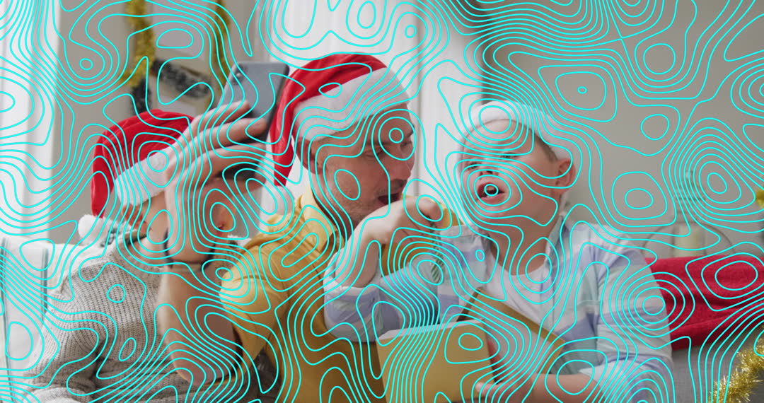 Abstract animation overlays video young family enjoying Christmas together. Father and two sons are using technology, suggesting modern connections during holiday season. Whimsical outlines create layered, playful appearance suitable for themes around family bonding, holiday season celebration, and digital lifestyle during festivities.