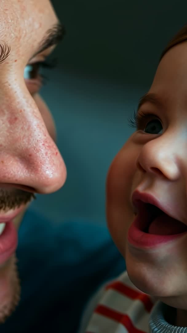 AI Generated Image. Video showing intimate closeup moment of father and infant locking eyes while smiling and cooing. Vertical format matching mobile-first platforms such as Instagram Stories, TikTok, Facebook Reels, and mobile ads. Soft natural light and shallow depth of field highlighting facial expressions, eyelashes, and joyful mouth movements. Use for parenting blogs, family marketing, fatherhood campaigns, baby product ads, pediatric or healthcare messaging, emotional storytelling, social media reels, or stock footage libraries. Clip working well as loopable closeup for background or hero content, cutaway for interviews and testimonials, or emotional opener for commercial and editorial projects.