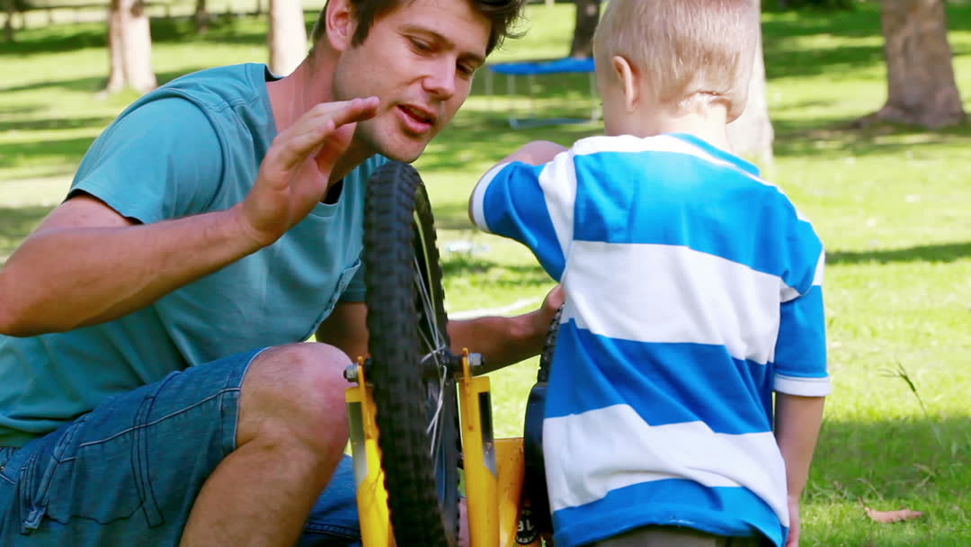 Father and son enjoy a sunny day in park, focusing on bike maintenance together. Ideal for themes on father-son bonds, parenting activities, or summer outdoor fun. Useful for educational materials or family-focused branding.