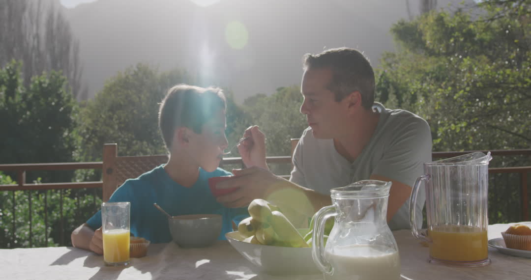 Backlit by sunlight, this scene captures a moment between a father and his son during a morning meal. They share breakfast at an outdoor table with milk, orange juice, and fruit, emphasizing themes of family bonding and healthy living. Ideal for promotions about parenting, family lifestyles, and outdoor dining experiences.