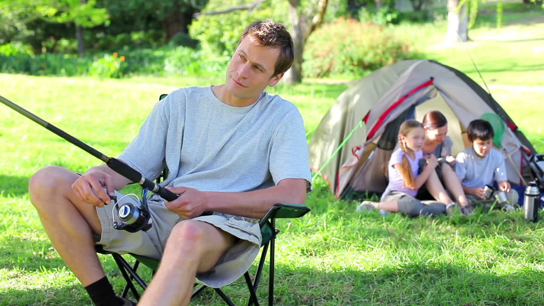 The scene shows a father enjoying fishing while camping with his family in the countryside. A tent is pitched in the background with children relaxing on the grass alongside another family member. This video is ideal for promoting family bonding activities, outdoor adventures, camping gear, and leisure time spent in nature.