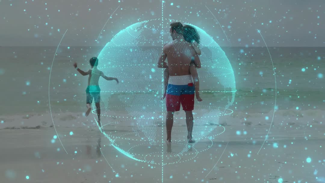 Video showing father holding child on shoulders at shoreline while another child running toward surf, teal digital globe overlay rotating and scattering dotted light elements across frame. Composition blending family beach moment with futuristic data visualization, creating contrast between warm human interaction and cool tech aesthetics. Suitable for tech campaigns, travel and tourism promotions, fatherhood and parenting features, augmented reality and global connectivity stories, beach resort marketing, summer lifestyle editorial, corporate presentations about digital transformation, social media ads and website hero banners. Recommended uses include looped background for conference displays, opener for family travel reels, overlay for product demos to convey global reach and human-centered technology. Footage responding well to warm grading to emphasize family warmth or cool teal grading to highlight digital motif. Add short captions about connection, protection, exploration to increase viewer engagement.