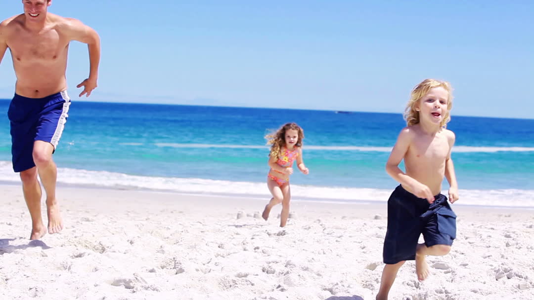 A joyful scene of a father and his two children running along a sunlit sandy beach. The clear blue ocean acts as a backdrop, emphasizing a fun and playful summer day. Ideal for promoting family-friendly vacations, summer beach activities, or advertisements focused on family bonding and active lifestyles.