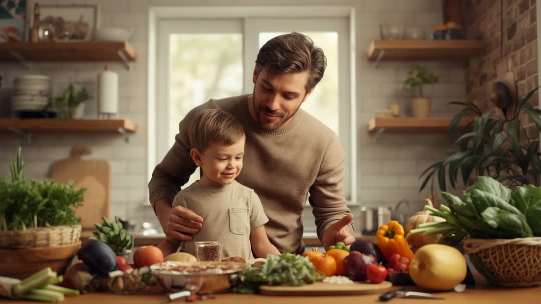 - Father Teaches Child About Healthy Cooking with Fresh Vegetables