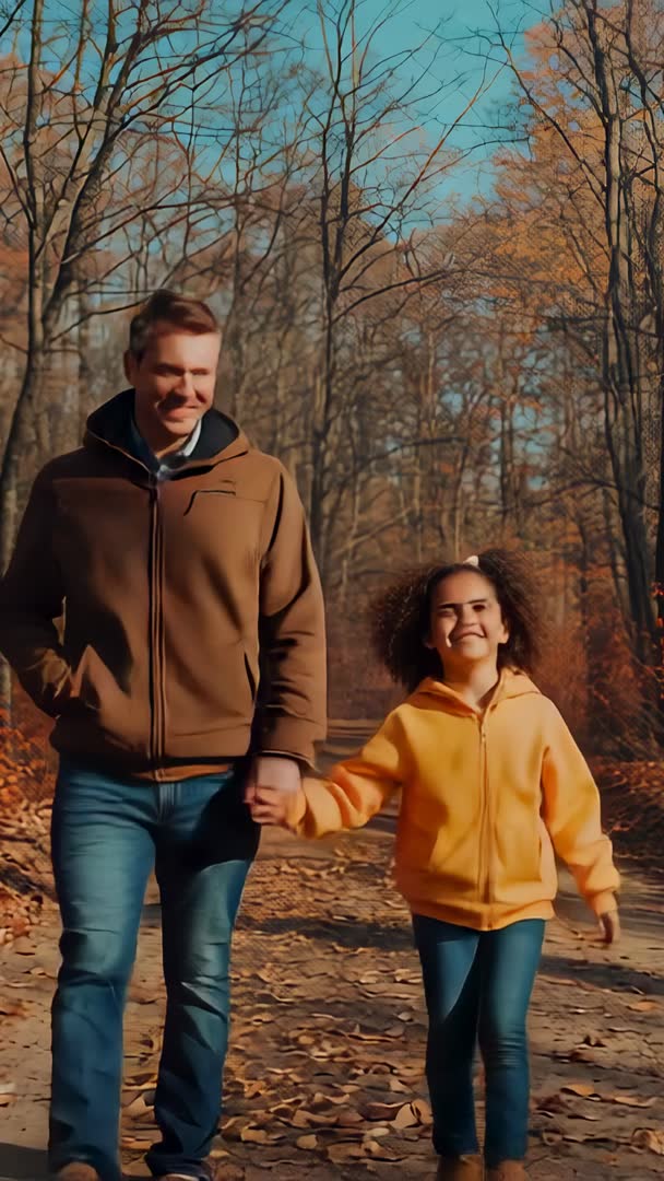 AI Generated Video. Capturing father and daughter walking hand-in-hand along autumn forest trail, sunlight filtering through bare branches. Vertical framing offering full-body movement and vivid fall foliage detail, ideal for mobile-first storytelling. Natural smiles and relaxed pace conveying family bond, togetherness, and joyful outdoor activity. Suiting social media reels, mobile ads, parenting and lifestyle vlogs, seasonal marketing, travel and outdoor wellness campaigns, Fathers Day promotions. Allowing safe crop to 9:16, 4:5, and 1:1 orientations while keeping subjects centered for headline overlays. Pairing well with acoustic guitar or warm indie folk music; applying warm color grade to enhance golden tones; adding gentle slow motion for emotional emphasis. Using as B-roll for commercials, opener clip for family documentary, background for blog header, hero footage for seasonal email campaign, or stock clip for parenting resources.