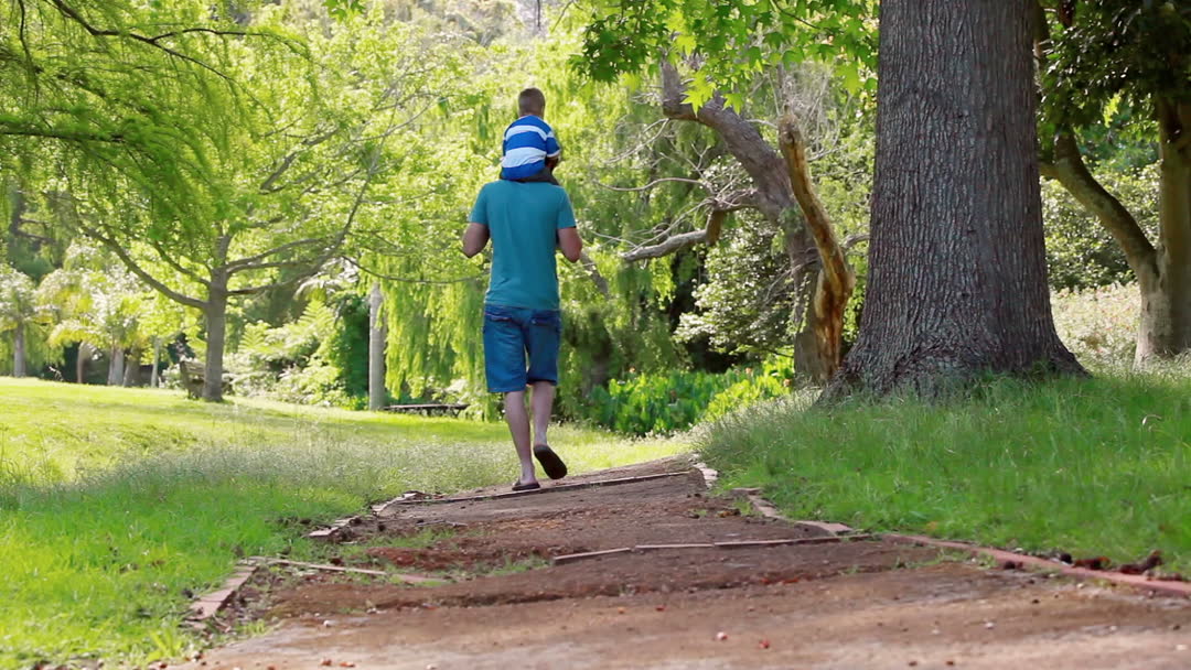 View features a father carrying his son on shoulders while walking through a verdant park. Scene encapsulates family bonding, leisure, and the joy of spending time in nature. Perfect for illustrating themes such as family life, parenting, togetherness, and outdoor leisure. Could be used in advertisements, family-focused articles, or social media posts highlighting familial joy and outdoor activities.