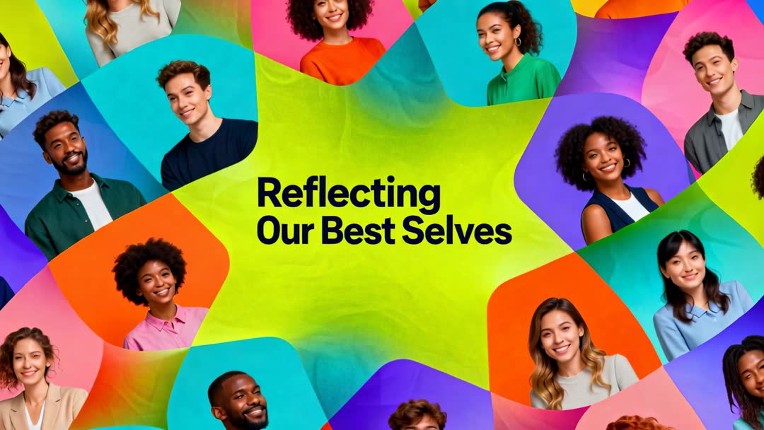 AI Generated Image. Video frame showing lime-green starburst center with Reflecting Our Best Selves title surrounded by colorful portrait tiles. Design featuring kaleidoscope collage, smooth gradients, and diverse smiling faces forming rotating mosaic. Scene serving as dynamic opener for inclusion campaigns, brand storytelling, employee engagement videos, recruitment ads, and social media promos. Visual composition allowing easy customization of headline text, color palette, and timing to match brand identity. Motion style providing upbeat, optimistic tone and strong center focal point for message delivery. Ideal for use in corporate presentations, web hero banners, broadcast spots, internal communications, and diversity or community events.