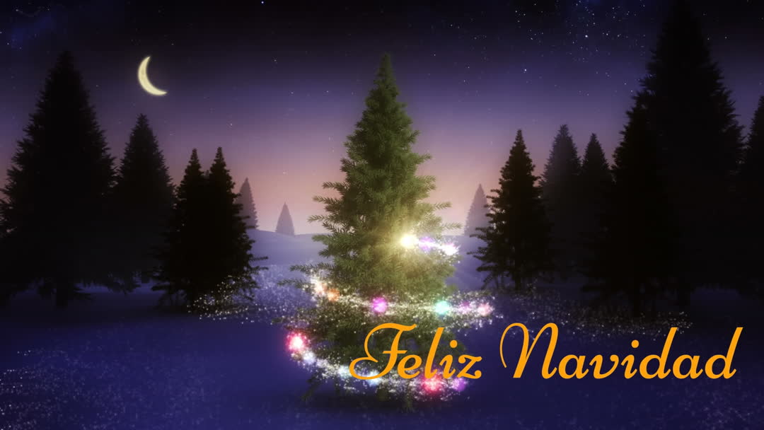 A beautifully animated scene featuring a Christmas tree adorned with twinkling lights. The night sky captures the essence of tranquility, with stars and a crescent moon overhead. 'Feliz Navidad' text gracefully complements the holiday atmosphere. Perfect for festive e-cards, digital greetings, or seasonal marketing materials.