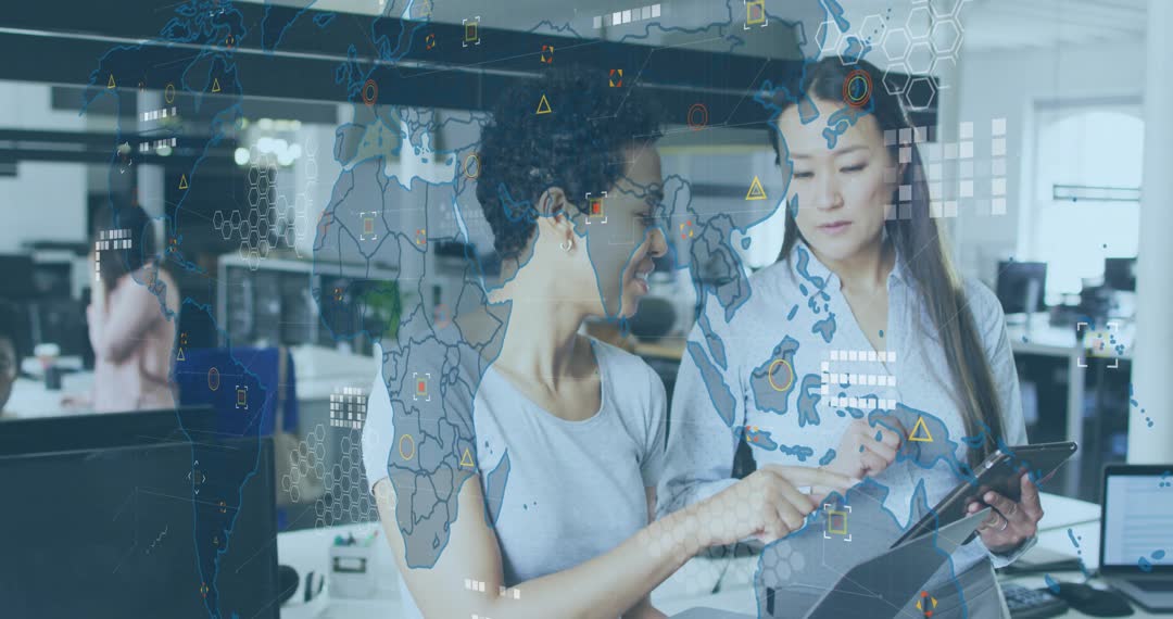 This video still captures two female analysts engaging in collaborative work through digital technologies, with a global map overlay enhancing the scene's modernity. They are actively discussing and tapping into a tablet device, indicative of real-time data analysis and strategic planning in a professional setting. Ideal for illustrating concepts such as global business, technological advancement in workplaces, teamwork in analytics, and modern professional environments.