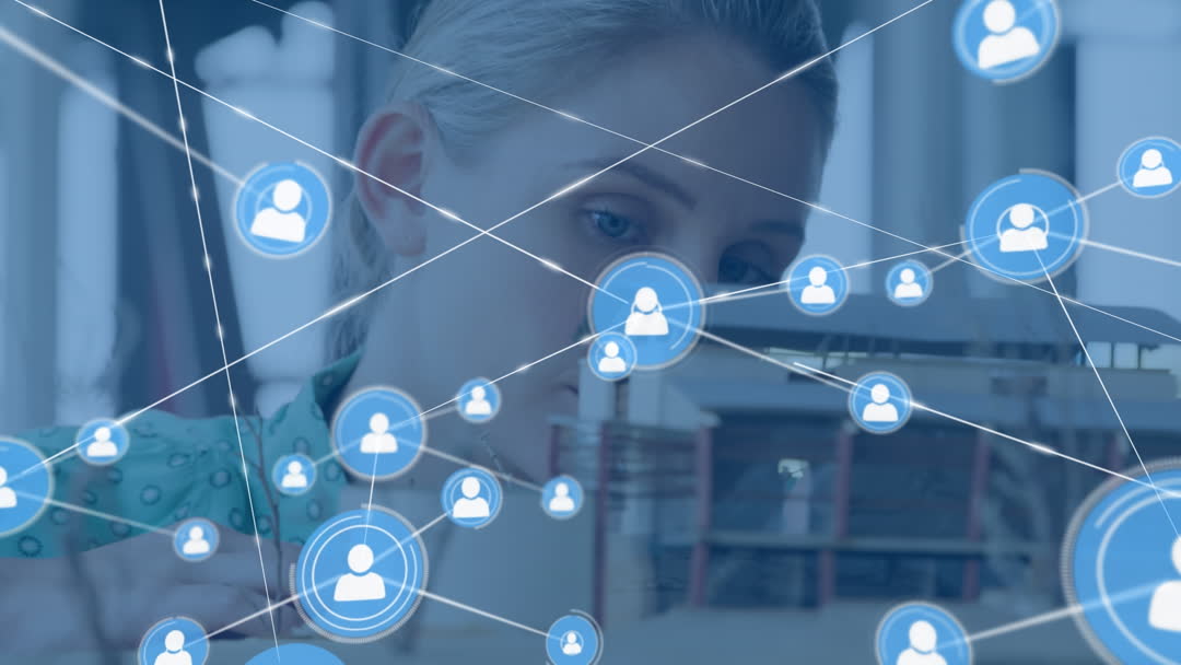A female architect working intently over architectural models in an office is overlaid by a digital visualization of networking connections and nodes. Perfect for representing modern digital integration in architecture, smart city concepts, and workspaces focused on connectivity and future technology innovation. Suitable for articles or whitepapers on technological advances in architecture or digital transformation in the urban planning process.
