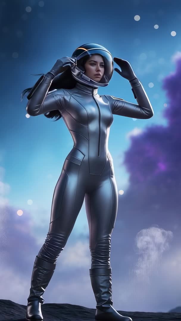 AI Generated Image. Vertical video showing female astronaut adjusting helmet seal while standing on rocky outcrop under vivid nebula and scattered stars. Suit design appearing futuristic and streamlined, helmet visor reflecting cosmic light. Mood conveying bravery, solitude, exploration and empowerment. Working well for sci-fi trailers, mobile story ads, social reels, cinematic intros, technology branding and space exploration campaigns. Keeping safe area for 9:16 vertical format, adding lower-third text overlay for title and call-to-action, applying teal-purple color grade to enhance nebula tones. Using short 6-15 second clips for social platforms or extending into longer cinematic sequence for film openers. Positioning copy and logos near lower two-thirds to preserve helmet and face visibility.