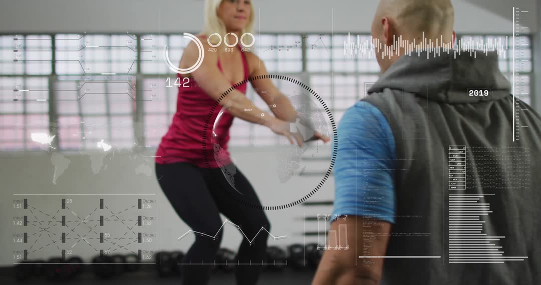 Video showing female athlete performing box jumps in gym studio while trainer timing session and HUD overlay displaying heart rate, rep count, performance graphs. Camera focusing on athlete movement and coach interaction, with digital data visualization layered over frame to emphasize biometric tracking and training analytics. Useful for fitness app demos, gym marketing, sports technology presentations, personal training websites, instructional workout content, and social media ads. Use for illustrating plyometric training, HIIT workouts, coach-athlete communication, wearable tech integration, or data-driven coaching. Suitable as intro clip, lower-third background, or overlay for broadcast and online content. Natural light from large windows, modern studio vibe, dynamic motion, clear emphasis on coach guidance and athlete effort.