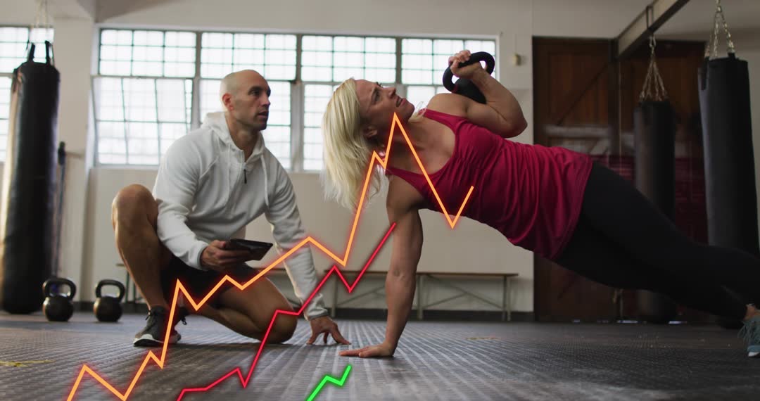 Video showing female athlete performing kettlebell sideplank row while coach recording reps on tablet and tracking progress with overlaid line chart. Scene capturing focus on core strength, balance, functional movement, and coach-client interaction in gym studio environment. Serving well for fitness websites, trainer portfolios, workout program promotions, social media ads, instructional tutorials, mobile app previews, and gym marketing campaigns. Helping illustrate exercise technique, progress tracking, performance analytics, and personal training services. Composition providing negative space for title or caption overlay and horizontal framing suitable for website banners and video thumbnails. Color and lighting offering natural look and clear subject separation for on-brand overlay and text.