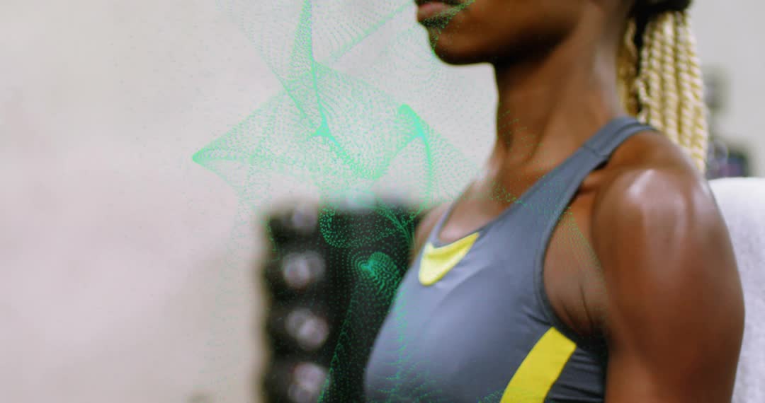 Showing female athlete performing seated dumbbell curls with green data overlay representing wearable rep-tracking. Close-up framing focusing on upper body, biceps, shoulder and grip while weight rack remains blurred in background. Overlay adding tech-focused visual for fitness tracking, progress visualization and training feedback. Footage working well for fitness app promo, wearable technology demo, gym membership advertising, online training programs, strength training tutorials, social media clips and health articles. Editing suggestions including adding lower-third text, animated callouts for rep count and form cues, upbeat soundtrack and speed ramps for rep highlights. Ideal for illustrating topics such as workout technique, wearable tech integration, strength progression and athlete focus.