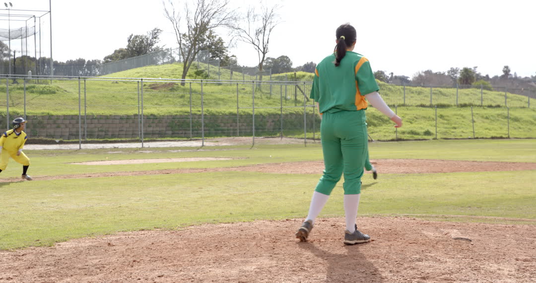 A dedicated female pitcher in a green uniform perfects her skills on a baseball field, embodying focus and athleticism. This scene captures the intense practice of a dedicated team player, embracing teamwork and competition. Ideal for illustrating athletic spirit, sports articles, or promotional material related to female sports teams.