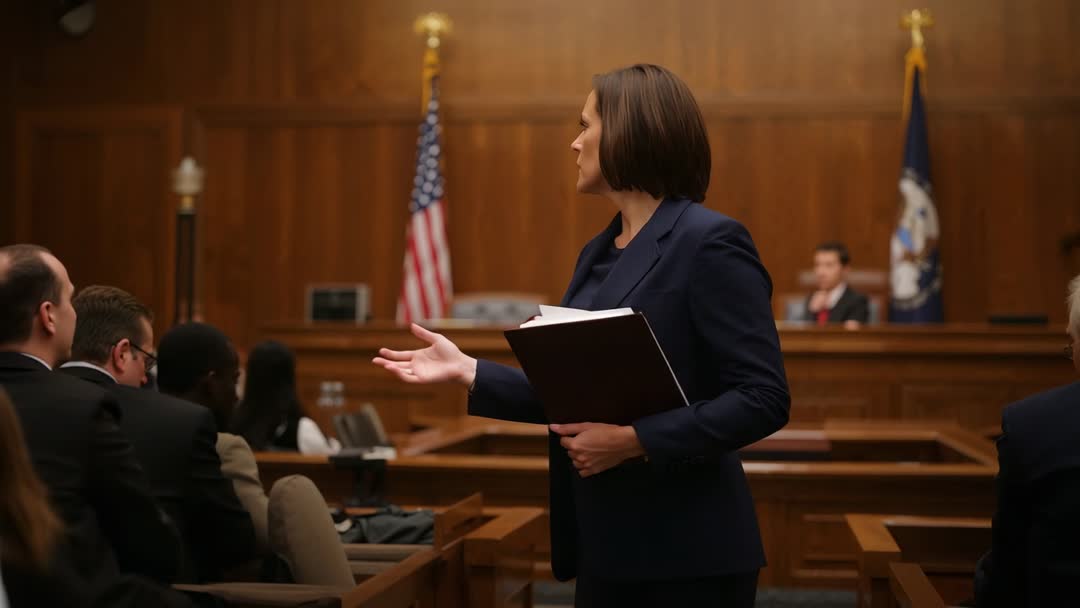 AI Generated Video. Featuring female attorney addressing jury while walking aisle and holding binder near judge bench and flags. Camera following movement, capturing confident gesture toward jurors and focused courtroom atmosphere. Lighting warm, wood-paneled courtroom giving formal tone and professional mood. Footage matching courtroom drama, legal documentary, news segment on trial, law firm marketing video, educational training for trial skills, jury instruction content, presentation on litigation strategy, corporate compliance courses. Edit-friendly composition allowing cutaways to jury, bench, close-up of binder, or wide courtroom shots. Licensing suitable for broadcast, web, corporate, and educational projects needing authoritative legal visuals.
