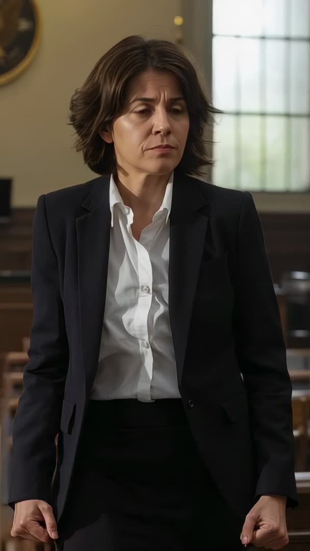 AI Generated Video. Female attorney reacting to off-camera cue while scanning crowd and holding folder, conveying focus and concern. Wearing dark tailored suit and white blouse, delivering professional and authoritative presence. Interior courtroom showing bench, court seal, and flag in background, providing authentic legal atmosphere. Vertical portrait orientation optimized for mobile and social media use, suitable for editorial and commercial projects. Use for legal news packages, courtroom drama trailers, law firm promotional clips, training and compliance videos, documentary sequences, and stock footage libraries. Suggested edits: add lower-third title, apply slow push-in zoom, use subtle cinematic color grade, overlay quote or case details, crop for story-driven social reels, and mix with close-ups and wide establishing shots for narrative pacing.