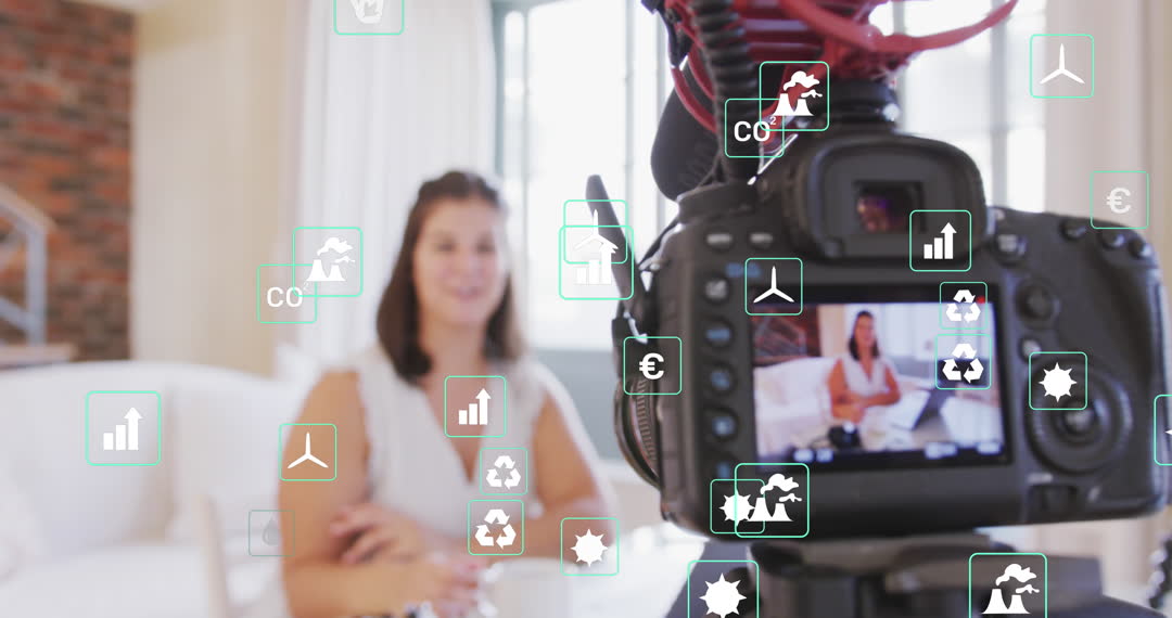 Female blogger sits in front of a professional video camera, creating engaging social media content. Colorful digital icons overlay such as analytics and recycling hints at diverse discussion topics. Ideal for illustrating modern influencer marketing, social media strategies, and online networking trends. Useful for presentations on digital transformation, influencer culture, and brand engagement strategies.