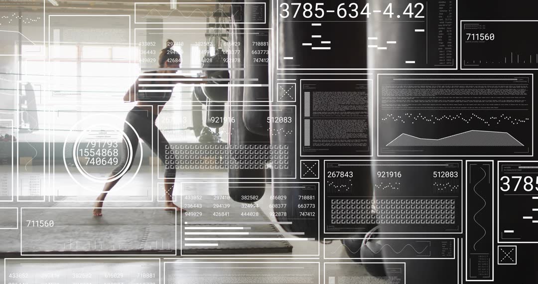 Woman engaged in boxing exercise, verified by real-time data on screen. Utilizes cutting-edge sports technology for detailed analytics and performance enhancement. Ideal for content about sports, technology, or health industries focussing on modern fitness practices.