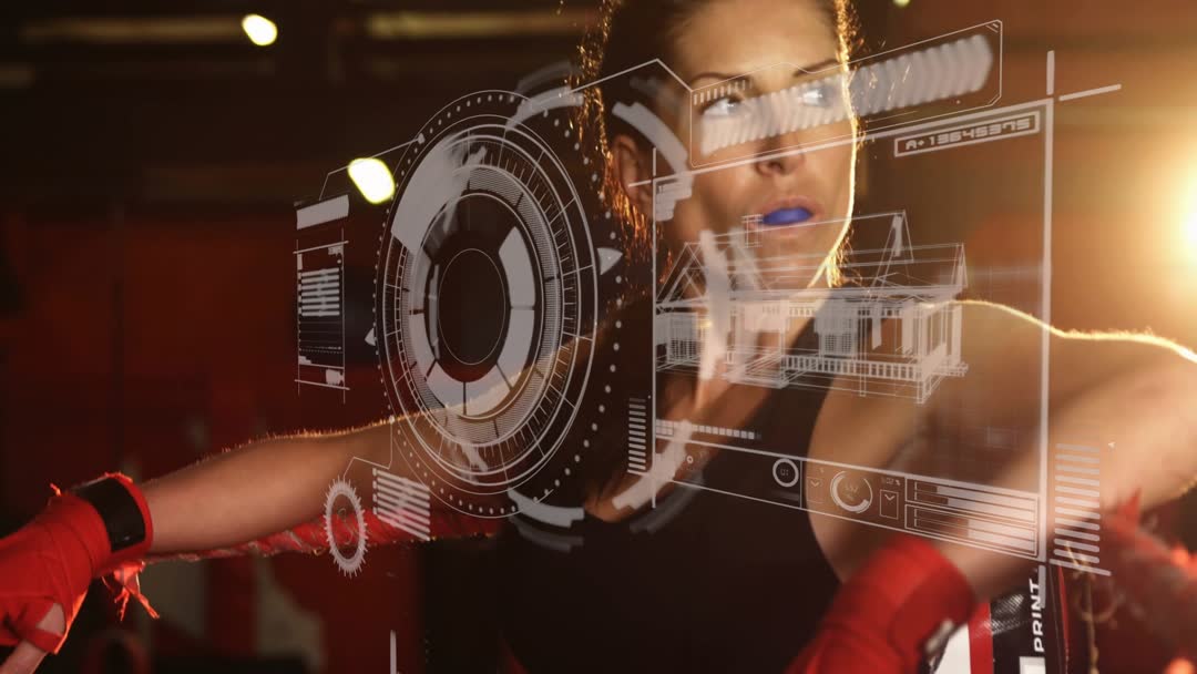 Video frame depicting female boxer leaning on ring ropes, shielding eye from glare while holographic HUD graphics overlay foreground. Lighting featuring warm rim light and strong contrast, highlighting sweat and muscle definition. Foreground showing blue mouthguard, red hand wraps, focused gaze, and architectural wireframe HUD suggesting training analytics and gym layout. Scene conveying high-tech training, athlete focus, and modern sports science. Ideal for marketing fitness technology, promoting virtual coaching apps, illustrating sports science articles, creating gym or fight promotion trailers, serving as dynamic thumbnail or hero for websites and social media, and enhancing editorial about wearable tech and athlete performance.