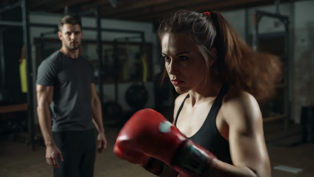 AI Generated Image. Video showing female boxer practicing jab-cross combo while coach watching in background inside gritty gym. Close-up on focused athlete wearing black tank and red gloves, motion blur on hair and glove conveying speed and power. Background revealing weights, racks, punching bags adding training context. Lighting creating dramatic contrast and emphasizing muscle tone. Use for fitness campaign, women's sports empowerment, boxing class promotion, athletic apparel advertising, training technique tutorial, motivational social media reels, website hero banner, fitness magazine feature, personal trainer portfolio, sports documentary sequence. Edit options include cutting into 3-6 second slow-motion clip to highlight technique, cropping to 16:9 for web, overlaying energetic soundtrack and motivational text, color grading for cinematic look. Clip working well as opener for training series or as close-up insert during sparring sequence. Ideal for commercial licensing and fitness content libraries.