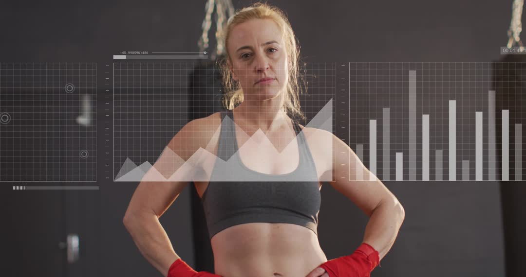 Frame showing female boxer standing with hands on hips in gym while transparent charts and bar graphs overlay torso, suggesting live performance metrics and training analytics. Athlete wearing red hand wraps and sports bra, looking focused and resolute after heavy bag session. Graphics showing line chart, area chart, bar chart and HUD elements conveying data tracking, progress monitoring and performance analysis. Use for fitness app promo, sports technology commercial, training program marketing, health tracking editorial, athlete profile video or corporate wellness campaign. Suggestions for use: add animated chart transitions, overlay brand logo and lower third, sync data highlights with voiceover or music, crop for social reels or hero banner, combine with workout tips or coaching narration for training tutorial.