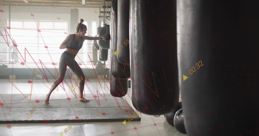 Video showing female boxer stepping forward and striking heavy bag during intense gym training. Heavy bags hanging in foreground while daylight streaming through large windows and mat floor grounding action. Timing overlays sweeping across frame, displaying countdown markers, data points and waveform lines for interval tracking and performance visualization. Camera capturing dynamic stance, straight punches and balanced footwork with gloves on. Useful for fitness and sports tech narratives, training app demos, workout tutorial clips, gym marketing campaigns, athlete profile segments, broadcast fitness pieces and social media workout reels. Suggested edits: apply slow motion to key strikes, add coach voiceover and on-screen drill names, crop to vertical for short-form platforms, integrate branding and metrics for app promo, use gritty color grade for edgy commercial.