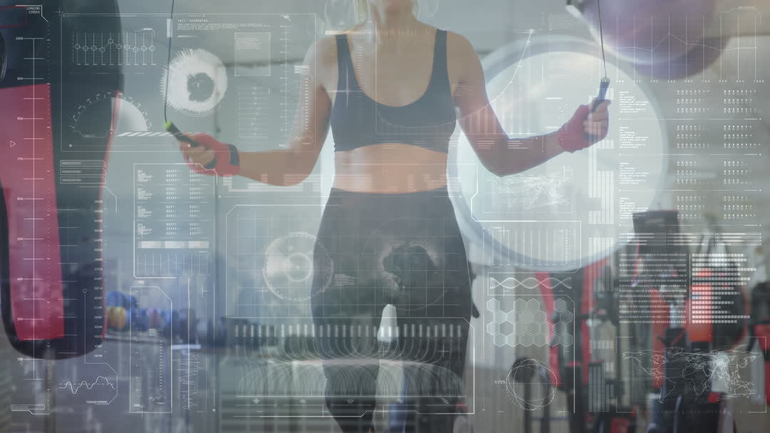 Young female boxer engaging in rope jumping exercises in a modern gym surrounded by holographic digital metrics. Perfect for illustrating themes of fitness technology, athletic training, and modern gym settings. Ideal for use in articles related to sports analytics, workout tech innovations, and promoting high-tech sports facilities.