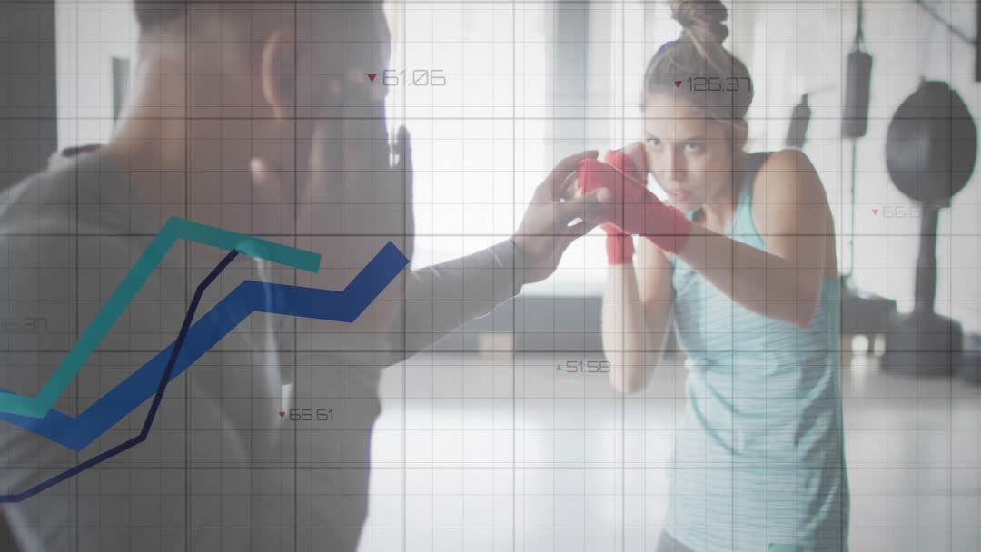 A female boxer is engaged in an intense workout, exhibiting power and agility as she practices jabs with a coach. The dynamic overlay of fitness metrics suggests data-driven insights about her performance, strength, and agility. This visual blend is ideal for use in conveying themes of cutting-edge sports science, motivational fitness contexts, or personal coaching scenarios. Perfect for marketing materials and content related to boxing training, high-performance sports, or wearable fitness technology promotions.