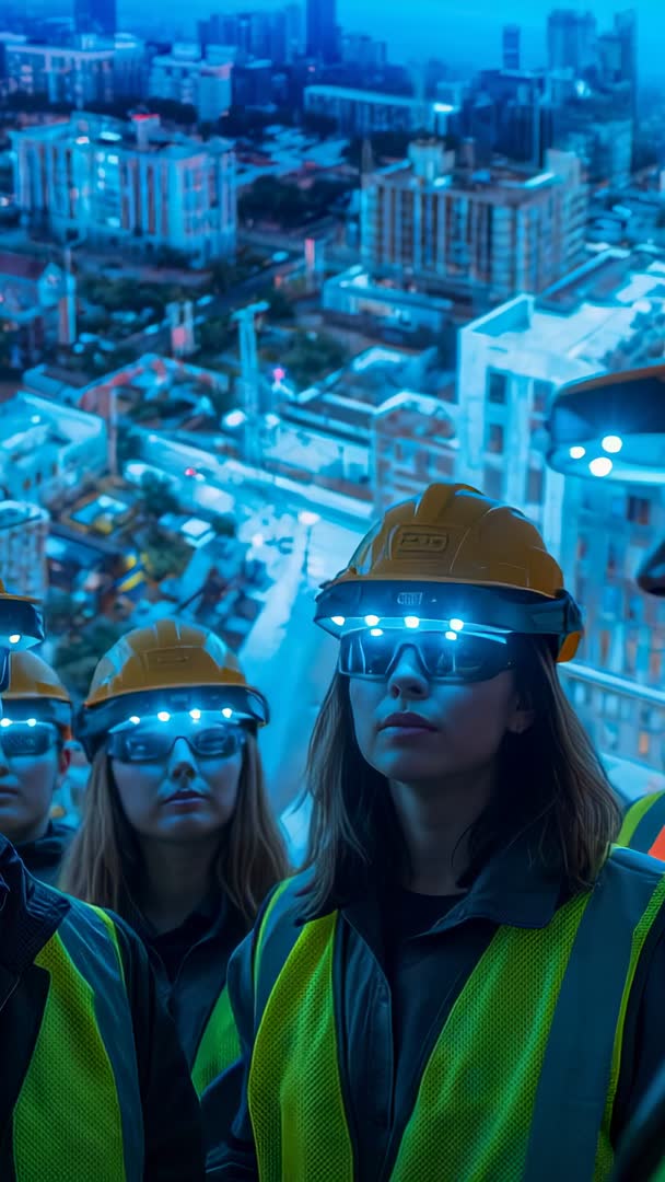 AI Generated Video. Vertical video showing female construction team wearing hardhats with integrated LED visors and AR glasses, surveying urban rooftop at dusk. Camera shifting and woman tilting chin while observing city skyline and rooftop details, creating cinematic, immersive mood. Blue city lighting and visor LEDs emphasizing high-tech safety gear and collaborative on-site workflow. Use for safety training and onboarding, corporate presentations for construction and engineering firms, marketing for wearable technology and AR solutions, urban planning and infrastructure reports, vertical social media ads, website hero reels for tech or construction brands, documentary segments about smart cities and modern building inspection.