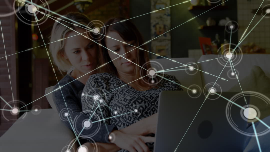 Female Couple Using Laptop with Virtual Network Graphics Video