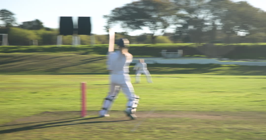 Dynamic moment capturing a female cricket player swinging the bat on a sunny outdoor field with teammates seen in the background. Perfect video for articles or advertisements related to sportsmanship, women's sports, and team spirit. Can be used for promotional material or blog posts discussing female participation in cricket or athletic encouragement.