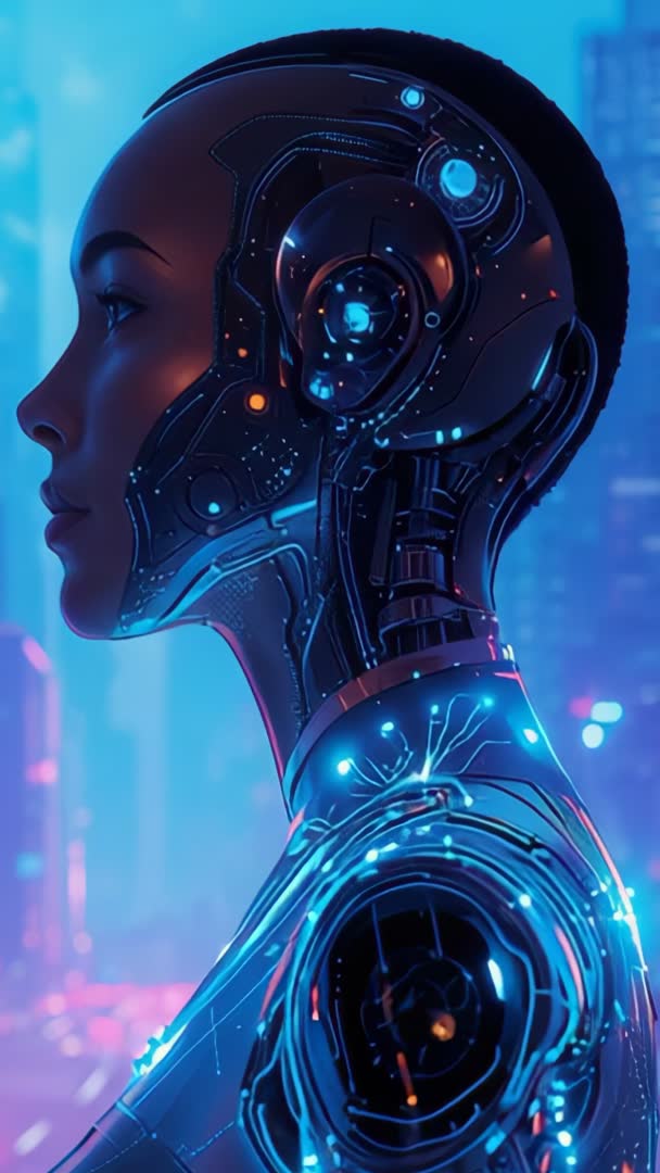 AI Generated Image. Vertical video showing female cyborg in profile receiving power surge, sending pulsing blue and cyan neon through plated neck and shoulder circuitry against blurred neon city skyline. Close-up on mechanical ear and layered armor panels highlighting glowing nodes and energy conduits, creating cinematic cyberpunk mood. Footage fitting tech brand promos, sci-fi trailers, app splash screens, mobile ads, book covers, and social media vertical reels. Suggested edits: make loopable short clip, add slow-motion ramp and electronic synth soundtrack, apply high-contrast teal and magenta grade, layer subtle lens flares and particle sparks, sync circuit pulses to audio. Use as hero visual for artificial intelligence campaigns, robotics presentations, fashion editorials with futuristic vibe, or background for title animations and UI overlays.
