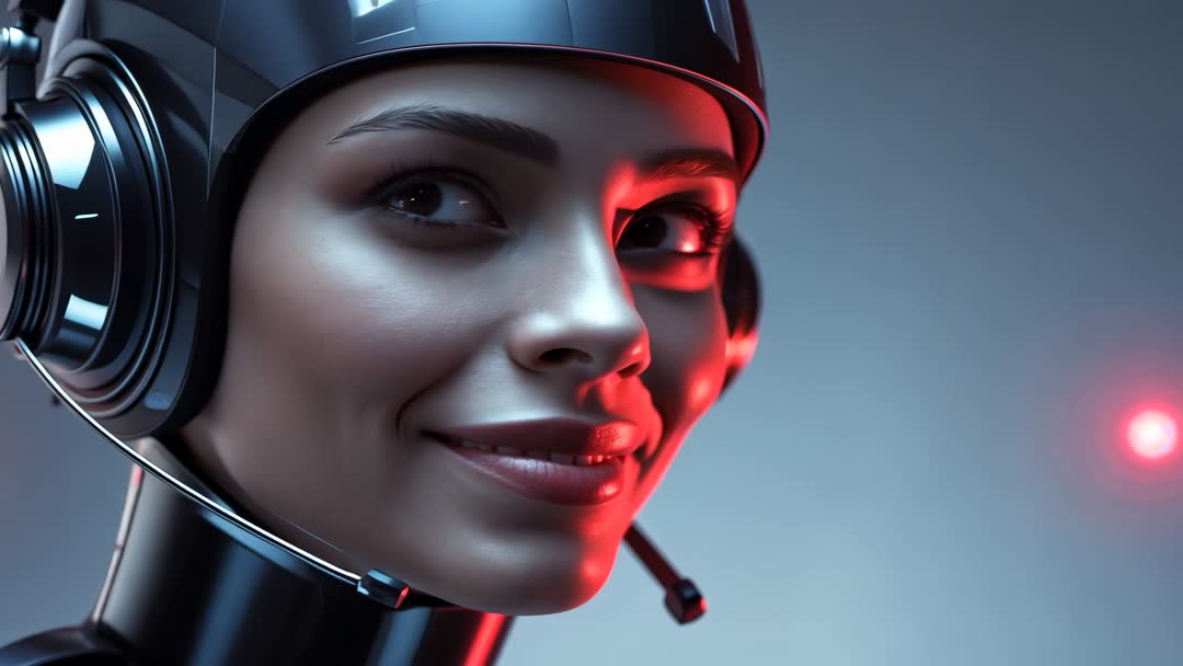 AI Generated Image. Featuring female cyborg turning head toward glowing red orb, responding to signal while wearing helmet with integrated headset mic. Capturing close-up three-quarter portrait with gleaming synthetic skin, reflective helmet surfaces, and moody neon red and blue studio lighting. Providing cinematic, suspenseful tone suitable for tech storytelling, AI concept pieces, and futuristic narratives. Using for commercial promos, product launches, corporate presentations, website hero headers, social media ads, sci-fi trailers, editorial features on robotics, and training materials for human-machine interaction. Offering editing-friendly composition with empty right-side space for titles, lower-thirds, or animated graphics. Supplying high-impact visual for branding, UX concept illustrations, investor pitches, and cinematic B-roll in design portfolios.