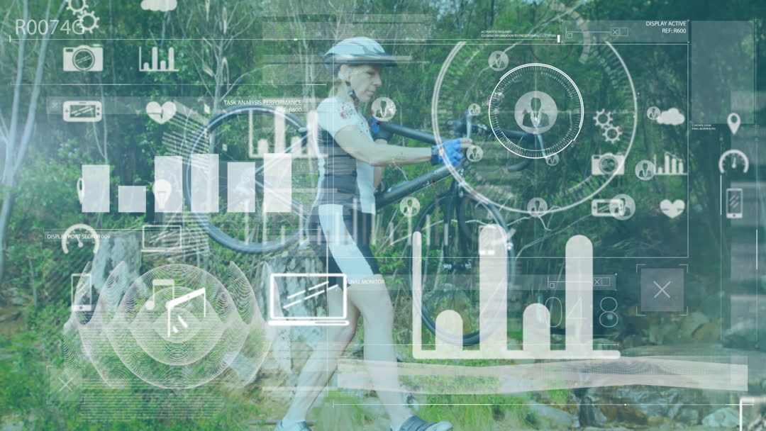 - Female Cyclist Carrying Bike with Overlay of Digital Data