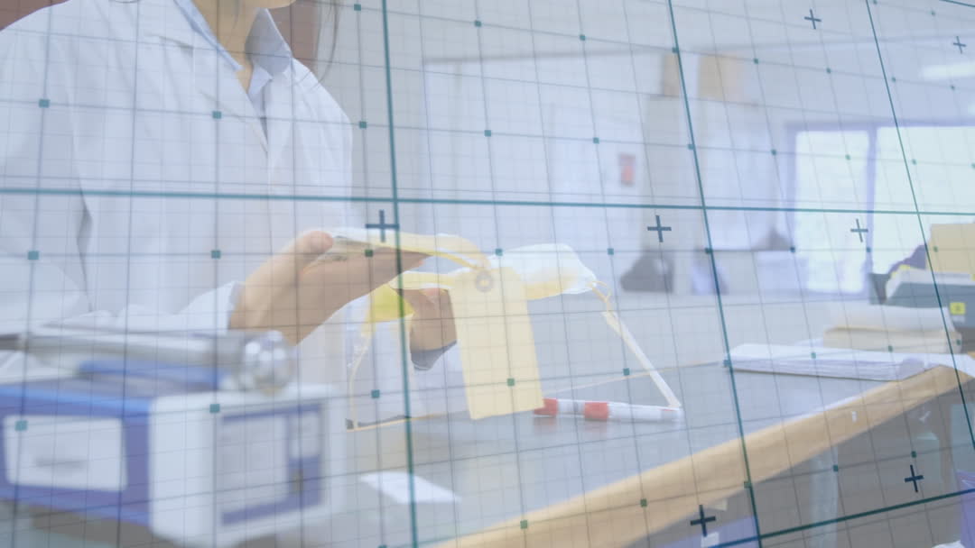 This video presents a female doctor in a laboratory, analyzing data with a digital interface overlay. It captures the fusion of traditional medicine and modern tech, indicating advances in healthcare innovation. This can be utilized in articles promoting technological advancements in healthcare systems, educational materials in medical courses, or campaigns aimed at recruiting healthcare technology professionals.