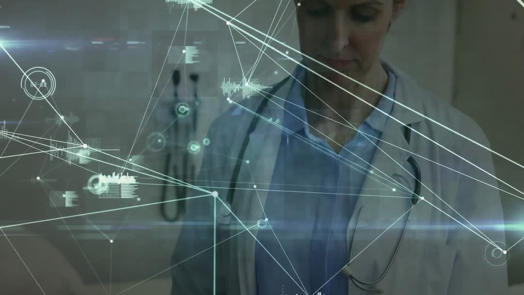 This video shows a female doctor in a clinic office examining data while animated network lines and graphs are overlaid, suggesting a blend of healthcare and advanced technology. Useful for illustrating themes of innovation in medical diagnostics, the integration of digital technology in healthcare, and modern medical practices. Great for websites, articles, and presentations focused on digital health advancements.