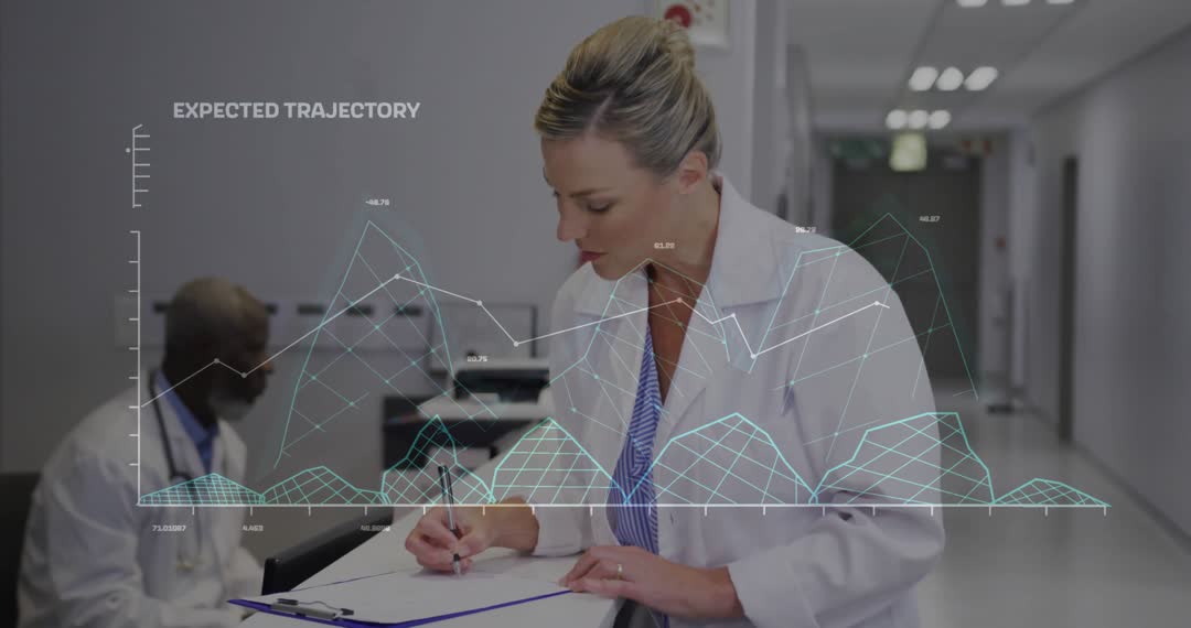 This dynamic scene features a female doctor focusing on filling a clipboard, with a transparent medical data analytics overlay. Ideal for content on advanced healthcare technology, electronic medical records, and the modern role of doctors in data-driven patient care. It visually represents the integration of analytics in the clinical environment, making it suitable for healthcare industry articles, medical tech insights, or marketing materials highlighting innovations in hospital settings.