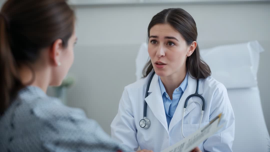AI Generated Image. Video clip showing female doctor explaining test results to patient while holding medical chart and clipboard. Scene focusing on compassionate communication, clear explanation of diagnosis, treatment options, and next steps, with attentive patient listening. Close-up framing highlighting facial expressions, body language, and stethoscope on doctor. Serving healthcare organizations, medical training, patient education, clinic marketing, hospital websites, telemedicine promotion, and social media campaigns. Serving topics covering doctor patient conversation, test result communication, informed consent, appointment follow-up, and empathy in clinical care. Offering neutral background and professional styling for easy editing, captioning, and localization.