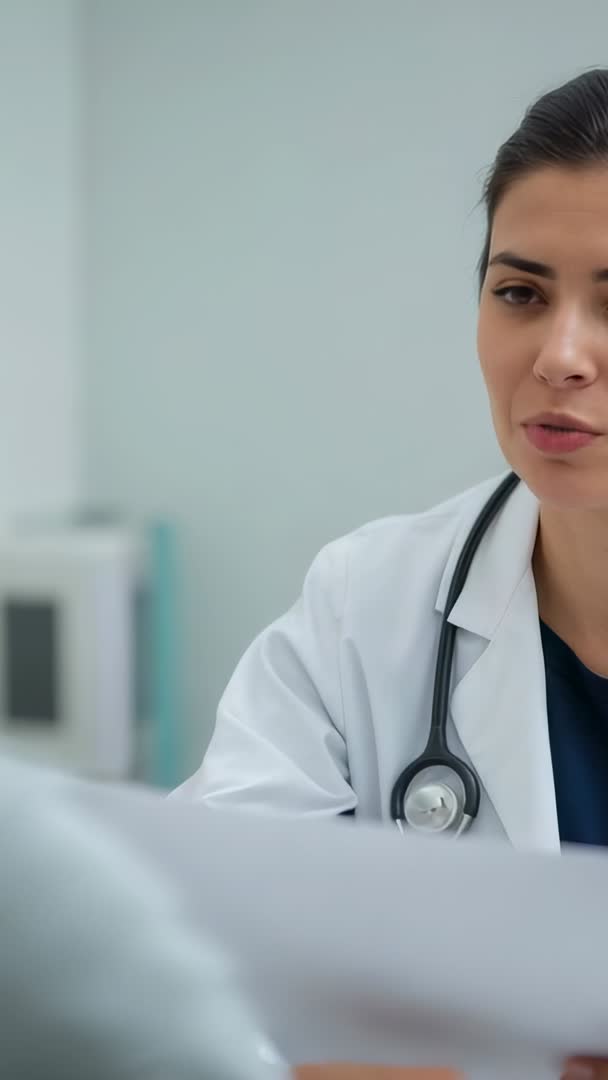AI Generated Image. Vertical video showing female doctor reading chart and explaining test results to patient during clinic consultation. Camera focusing on upper body and stethoscope while doctor gesturing and providing reassurance. Footage conveying trust, empathy, professional care and clear communication. Serving medical websites, patient education materials, clinic social media, healthcare marketing, staff training and telehealth promotion. Working well as website banner, Instagram reel, TikTok clip, mobile ad, patient onboarding video and medical vlog thumbnail. Supporting campaigns about diagnosis explanation, chronic care management, patient-centered communication and physician bedside manner.