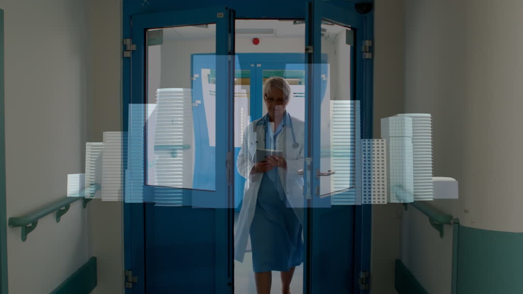 A female doctor dressed in a blue uniform and white coat walks down a hospital corridor with digital data graphics projected in front of her. The layers of information suggest the integration of technology and healthcare. This video illustrates the impact of data analytics in modern medical practice. Ideal for articles or presentations on digital transformation in healthcare, technology's role in hospitals, or the future of medical professions.