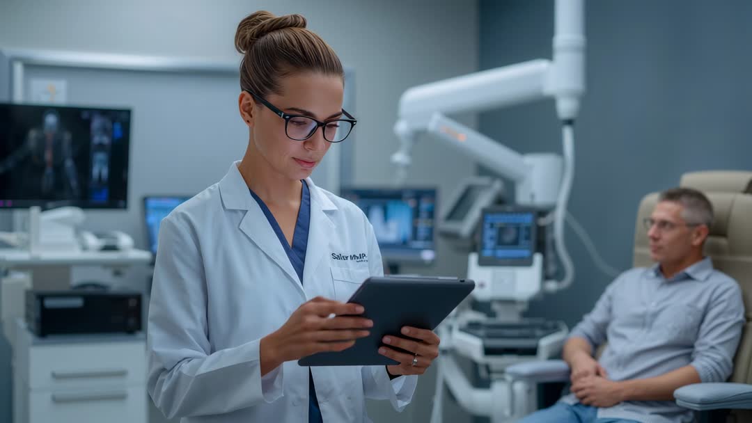 AI Generated Image. Showing female physician reviewing digital scans on tablet while male patient waits in examination chair, with medical monitors and diagnostic equipment visible. Conveying modern clinic workflow, clinician interacting with health technology, and patient-centered care. Useful for promoting telemedicine, radiology services, medical AI tools, electronic health records, and digital diagnostics. Suitable for hospital websites, clinic marketing, patient education, medical device brochures, telehealth app demos, training modules, and editorial articles about healthcare innovation. Composition allowing text overlay and cutaway shots for B-roll, plus close-up and wide-angle options for dynamic video editing. Licensing available for commercial and editorial use.