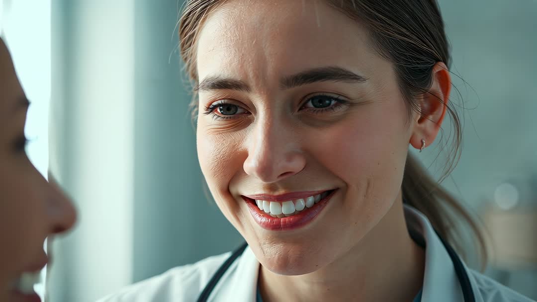 AI Generated Image. Close-up video frame showing female doctor smiling while leaning toward patient, sharing reassuring expression and conveying empathy. Medical professional wearing stethoscope and white coat, building trust through eye contact and warm smile. High-resolution, photoreal, AI generated visual delivering calm, personal mood for healthcare storytelling. Suiting healthcare websites, clinic advertisements, patient education videos, telemedicine promos, staff training on bedside manner, and wellness campaigns. Editing suggestions: using subtle intro music, gentle zoom toward face, warm color grade, adding lower-third text for name and contact, pairing with voiceover about patient care.
