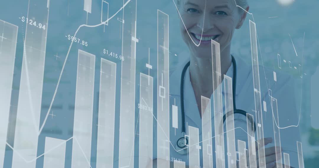 - Female Doctor Standing Behind Financial Data Overlay with Charts