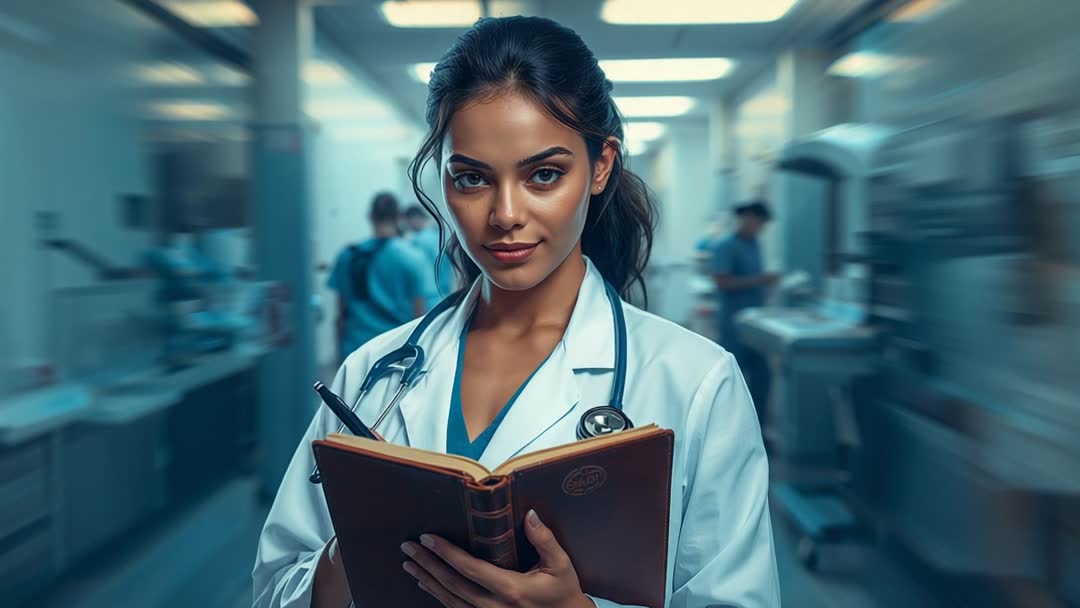 AI Generated Image. Showing female doctor in white coat walking corridor during busy hospital rounds, glancing down while writing in leather notebook. Stethoscope resting around neck, pen poised, expression focused and confident, background featuring blurred clinical staff and equipment to convey motion and urgency. Capturing real-time clinical documentation and patient care workflow, making content useful for training and communications. Suggesting uses in hospital recruitment videos, clinical education modules, medical training presentations, telemedicine promotion, patient safety campaigns, healthcare marketing materials, editorial news segments about healthcare workforce, and website hero visuals for clinics and hospitals. Supporting voiceover about rounds, documentation best practices, teamwork, and clinical decision making.