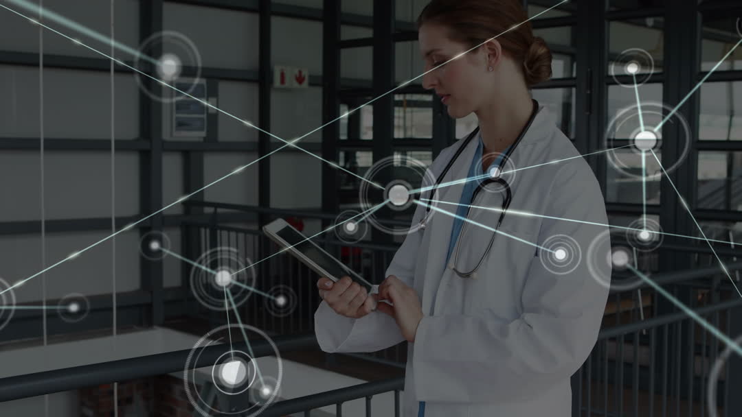 - Female Doctor Using Tablet with Futuristic Network Overlay