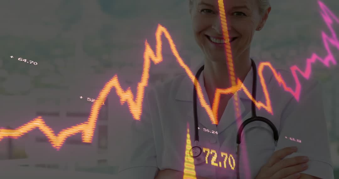 This video frame features a female physician with a stethoscope analyzing a dynamic line graph overlay representing medical data and healthcare analytics. It signifies a modern approach to diagnostics and professionalism in healthcare environments. Ideal for use in articles or presentations focused on the integration of technology and medicine, healthcare innovation, or data-driven medical diagnostics.